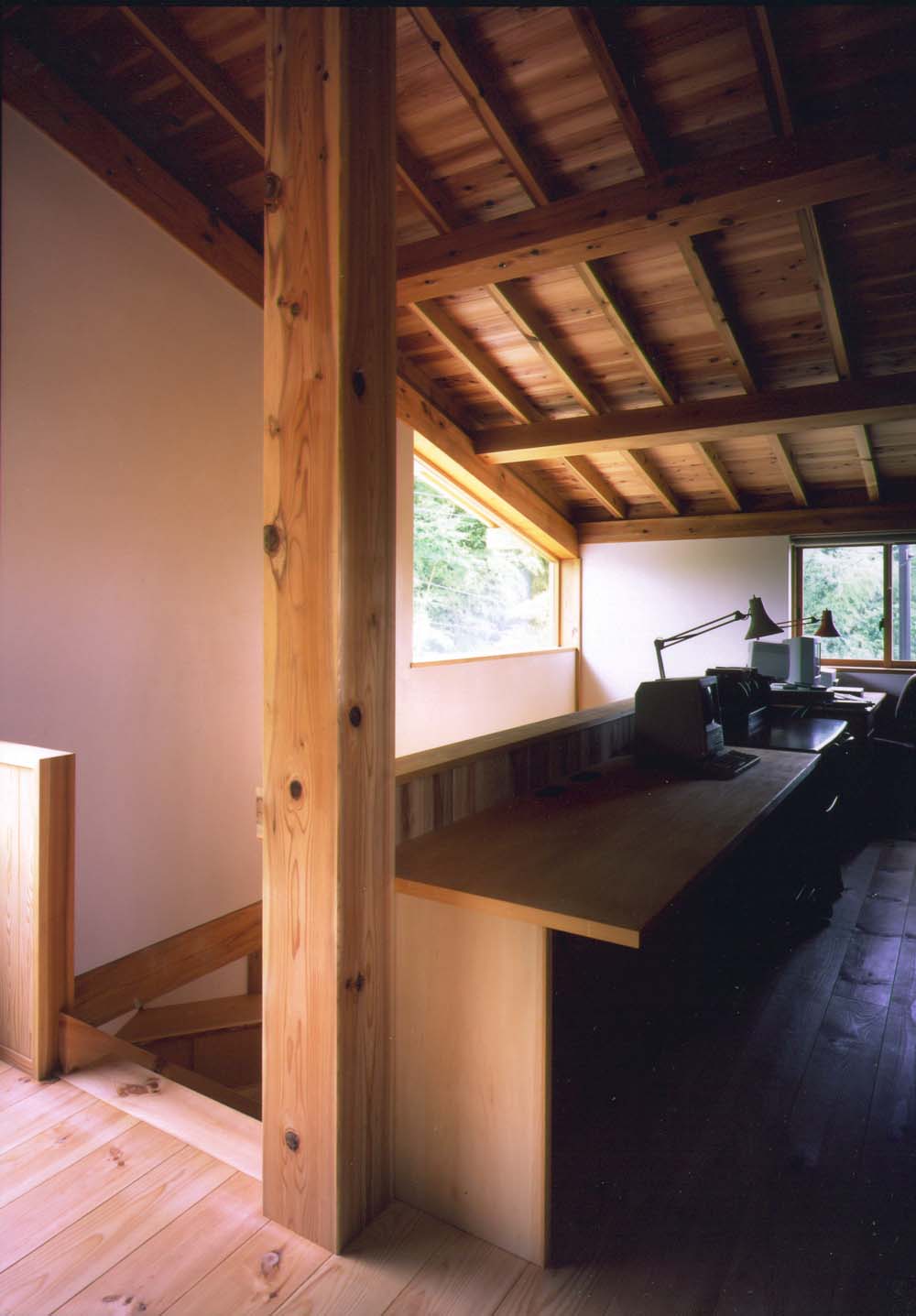 配置はその敷地に沿った形とし、緑地に面して大きな屋根を掛けました。その大きな屋根が掛かっている2階は間仕切りを作らずに一室空間としています。部屋は可動の家具で仕切、屋根の構造体を全体を通して表すことで一室であることを強調しています。1階部分は必要な諸室を下屋で張り出し、たる木を表して見た目のリズムを作っています。
